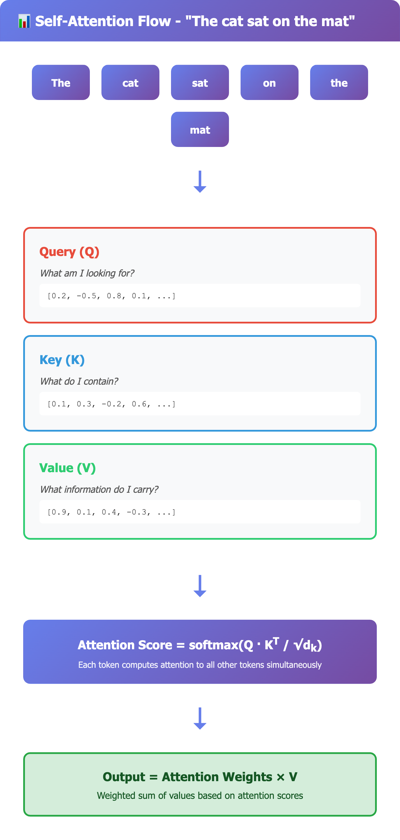 Each token builds a new representation by pulling information from relevant tokens, weighted by attention scores.